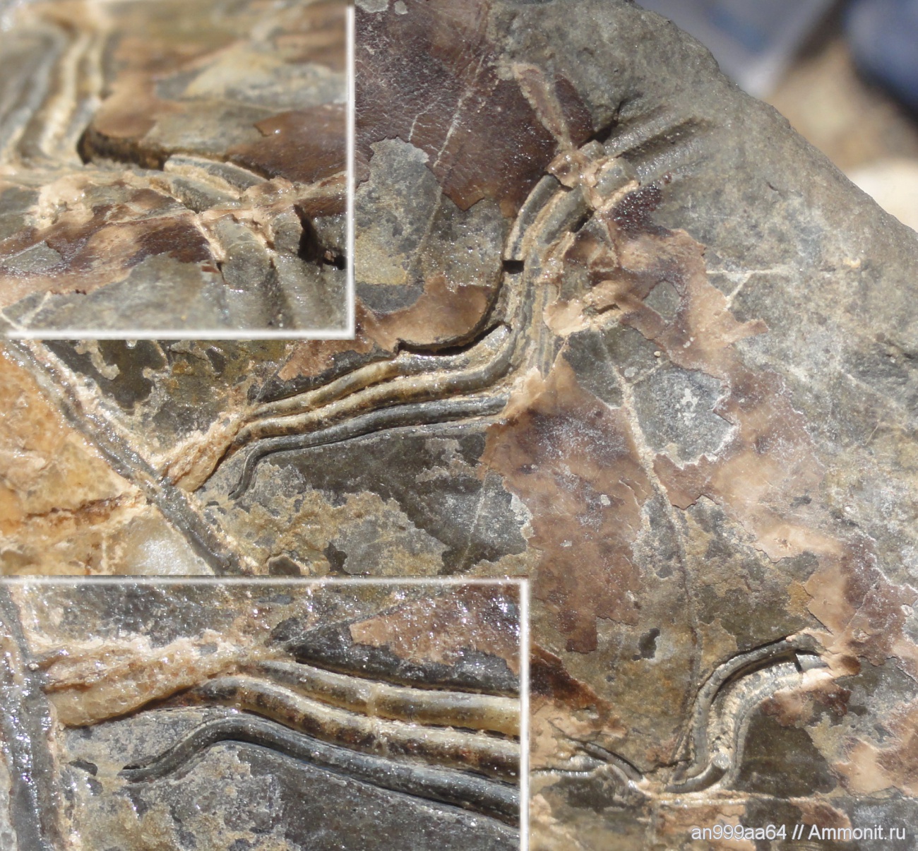 какие-то особо наглые создания длиною около 5 см. небольшой группой лезли напролом через перегородки под оболочкой аммонита , даже и не знаю как их обозвать