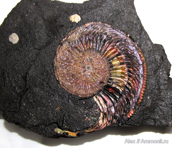Расцветка очень красивая )) А про "павлиний хвост" ни разу не слышал )) Скорее всего этот ростр был более функциональным, чем пав линий хвост. Вероятно, он поддерживал воронку и брюшную часть тела аммонита при быстром плавании. | ||||||