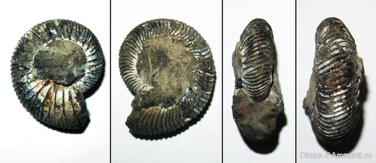 На первом изображении видно, что аммонит ни чем не отличается от своих здоровых собратьев. А вот на изображении этого аммонита с другого бока, а так же по всей вентральной стороне видно, что он пострадал еще в раннем детстве, в связи с чем произошло сильное искажение в скульптуре раковины.