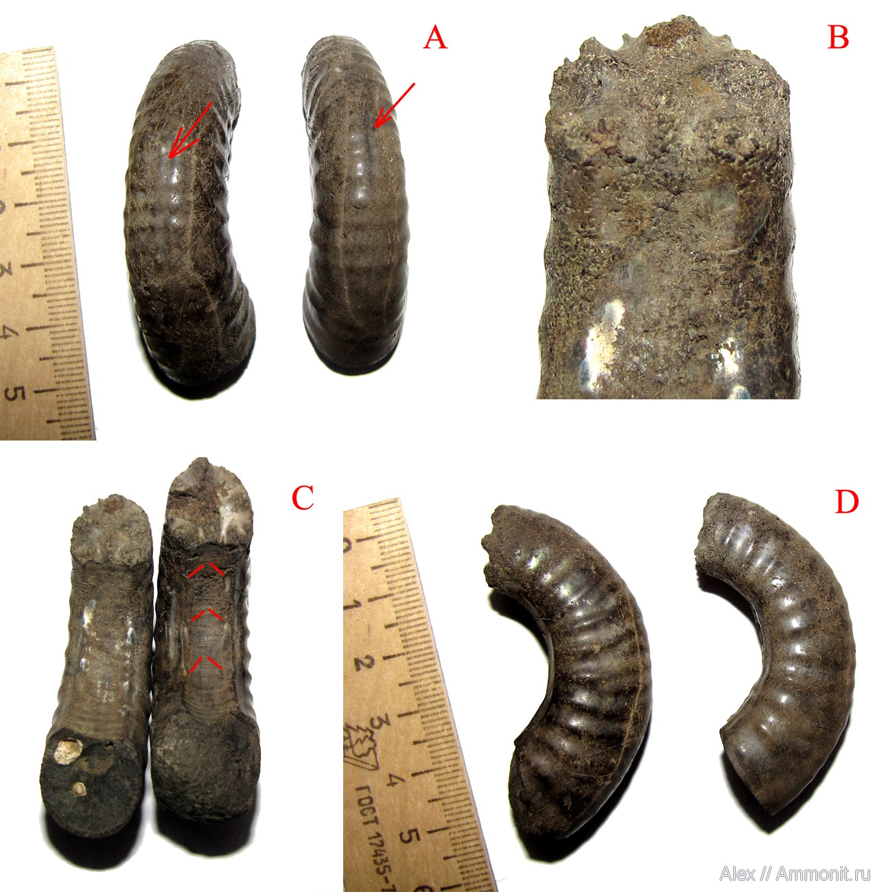 Это начальные части жилых камер микроконхов Euaspidoceras (их относят к роду Mirosphinctes) из семейства Aspidoceratidae. По вентральной стороне у них проходит неглубокая борозда (показана стрелочками на рис.А). На внутренних сторонах видны парные ямки, свидетельствующие о том, что на ранних оборотах у этого аммонита были парные вентральные бугорки (показаны на рис. С).