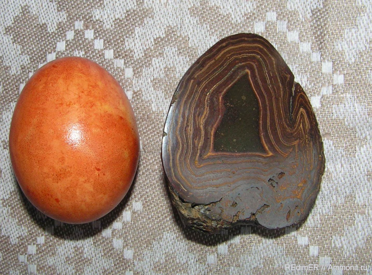 Так ведь пасха!!Слева на мой взгляд обычное куриное яйцо!))А справа на гемосидерит похоже,хотя в минералогии не силен) | ||||||