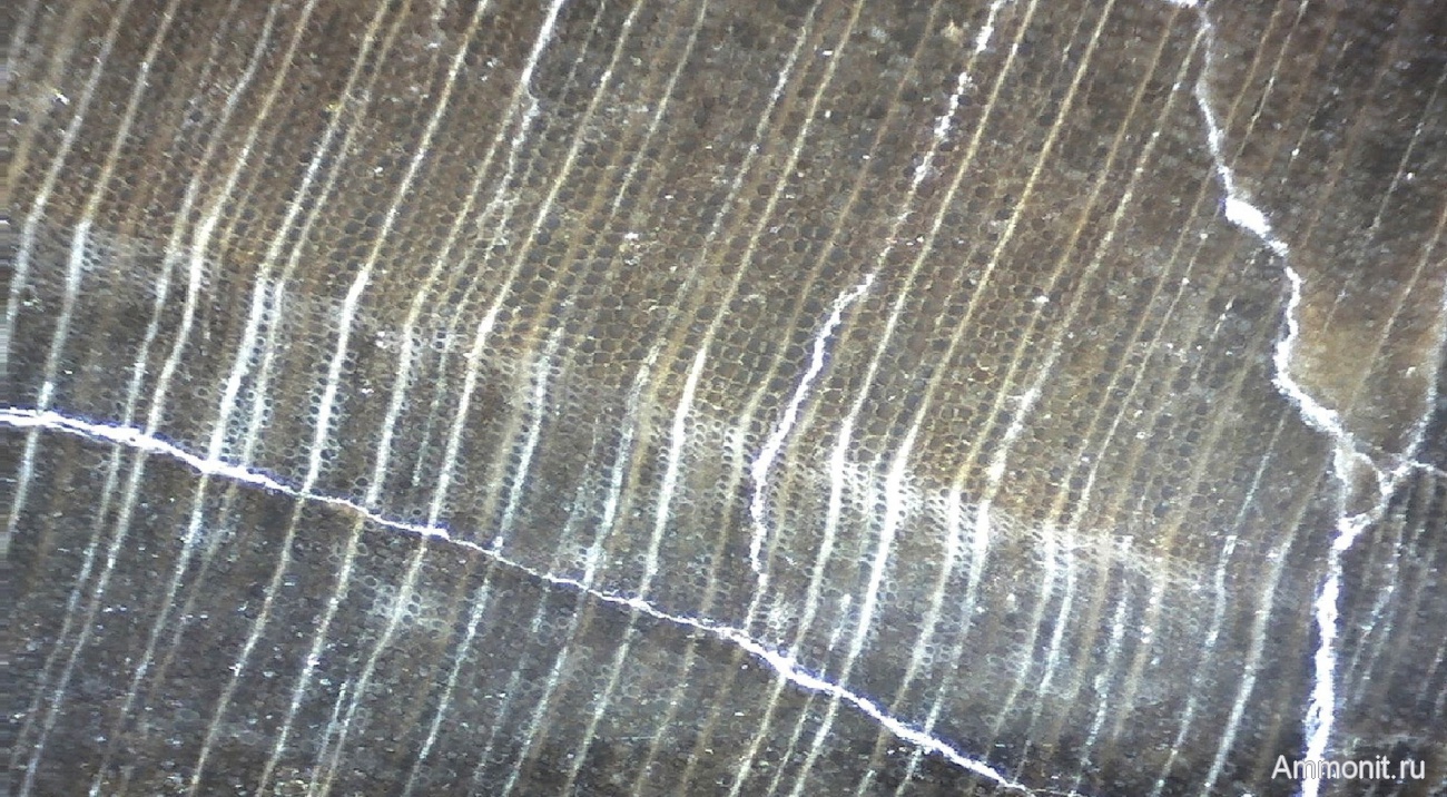 На снимке - увеличенный фрагмент одного из "колец роста". Колец годичных в нашем понимании в верхнем карбоне быть не могло. И все же налицо изменения формы клеток, очень напоминающие раннюю (крупные, тонкостенные клктки) и позднюю древесины (клетки поменьше, как бы сдавленные, с более толстыми стенками).