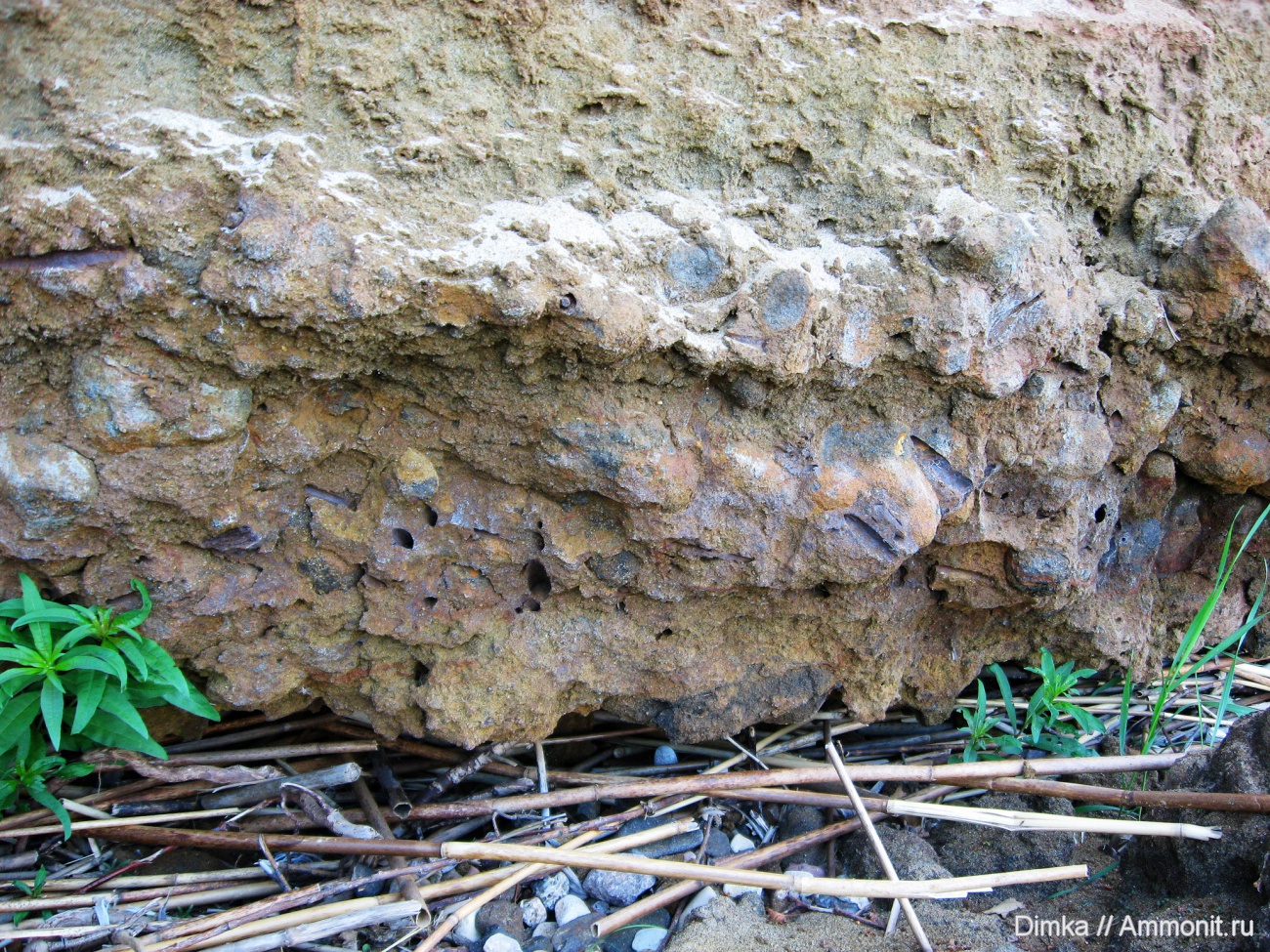 На фото слой плотного песчаника зоны Virgatites virgatus, с очень твердыми фосфатизированными конкрециями. В самом слое отчетливо видны многочисленные пустоты от ростров белемнитов. Мощность слоя в среднем около 60-70 см.