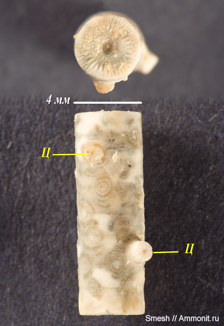 Часть стебля криноидеи с цирри из ~10-го слоя разреза "У 55-го километра". Для ясности отмечены буквой "Ц".