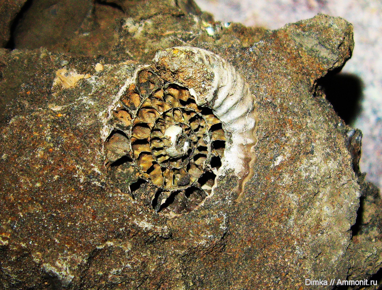 Ну цвет может от освещения/вспышки таким стал. А песчанистость вот такая, может еще от увеличения так проявилась, аммонитик то всего 30 мм. Но он точно из плиты, с другими краспедитами и гарниерицерасами. | ||||||