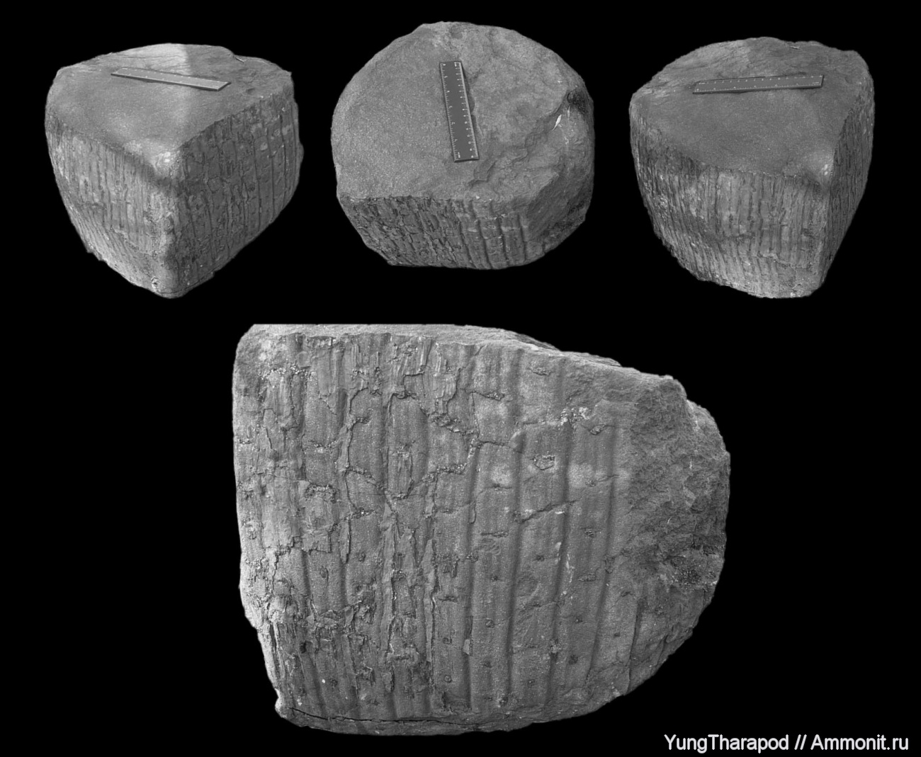 Этот пенек сигиллярии примечателен свои подпрямым углом, образовавшимся, видимо, под давлением породы. Сохранилась углефицированная корка.