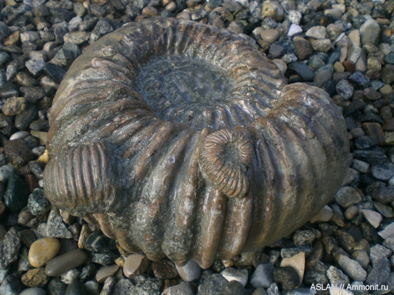 Еще одна крупная раковина аммонита Procheloniceras albrechti-austriae после очистки ее от породы. Раковина в целом оказалась в неплохой сохранности. Лишь в некоторой части она подверглась небольшой эрозии.При этом мы обнаружили еще несколько раковин принадлежавшим более молодым особям этого же вида.