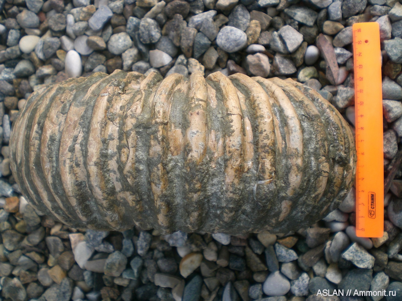 Вид сбоку. Такие крупные массивные раковины говорят о том, что воды Аптского моря, в котором они обитали, были очень теплыми. Более толстые обороты этих аммонитов подсказывают, что они не могли быть очень быстрыми охотниками, а являлись в основном падальщиками.