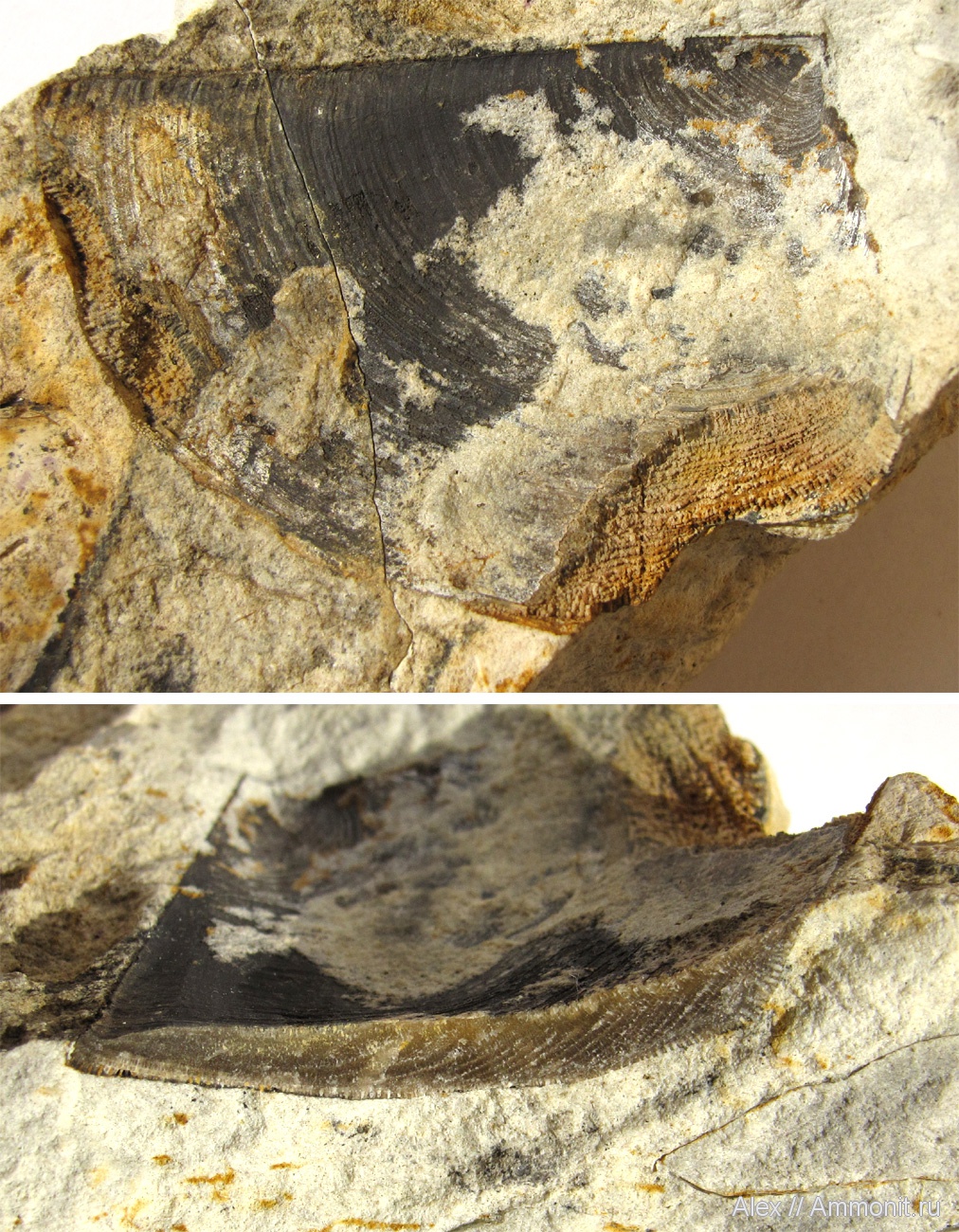 Этот самый крупный из найденных мной аптихов Laevaptychus длиной 6,5 см, был обнаружен в огромной плите спонголита и в процессе извлечения из нее раскололся на две части. Но нет худа без добра - у нас появилась возможность увидеть "срез" крупного аптиха. Ширина аптиха в месте раскола 4 см, максимальная толщина в этом месте 4 мм. На "срезе" видна столбчатая структура аптиха и его линии нарастания.
