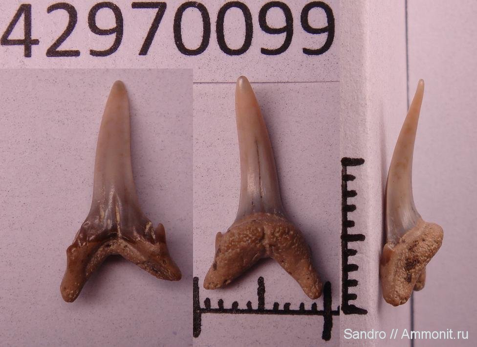 Один из передних зубов песчаной акулы Eostriatolamia subulata.