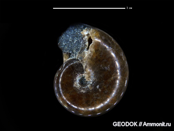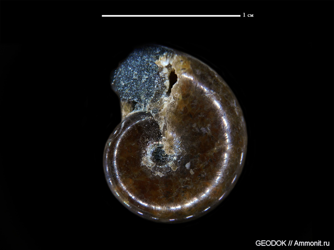Маленький красивенький филлопахицер. Очень интересная фоссилизация - темный кальцит, выглядит как ювелирная побрякушка.