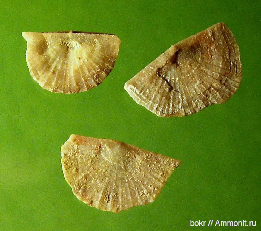 Небольшие плоские строфомениды из глинистых слоев карьера. Ширина раковин 12-15 мм.
