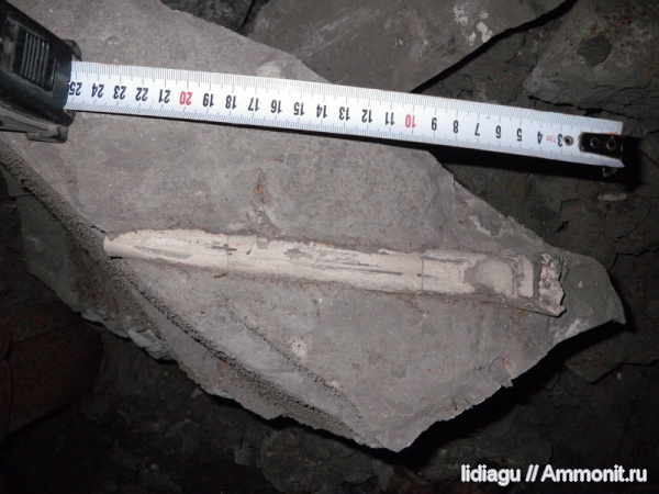 Белемнит в глиняном прослое из бокового вывала пород, штольня №2, шахта "Новокашпирская"