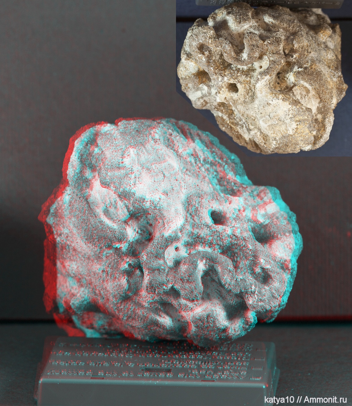 Эта губка – подарок уважаемого Евгения (EvgenyK). Губка имеет очень характерную коническую форму, поверхность с выраженными извилинами и отверстие по оси конуса. Если фотографировать её в «обычном» двухмерном виде, выразительность её форм теряется (фото на врезке вверху). Поэтому мы решили сфотографировать её в трёхмерном виде. Уважаемый Valerius в публикации Палеонтологические образцы в 3D изображениях (вторая часть) подробно рассказал, как это делается. Если следовать его рекомендациям, то всё получается! Для просмотра нужны очки, которые теперь есть у многих. Можно взять красное и бирюзовое стёклышки. Так губка смотрится гораздо лучше. Видно, что она конической формы, и что у неё очень глубоко изрезанная поверхность. Таких губок у Евгения ещё не было, поэтому точно определить её название я не смогу.