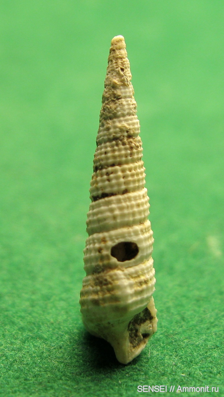 На сегодняшний день самый крупный моллюск этого вида(1,9см. при макс.диаметре 4мм.)Видно,что не хватает несколько начальных и последних оборотов,значит при жизни гастропода была более представительной. Впрочем,есть фрагмент гастроподы этого же вида диаметром 6мм,так,что стремиться есть к чему.Повреждение на боковой поверхности скорей всего связано с условиями консервации.