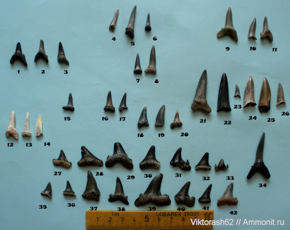 №20 - это скорее всего Macrorhizodus(если нет следов присутствие боковых зубцов). №31(так же как и 33) - это джекелотодус, а не стриатоламия. 40 - это боковой стриатоламии. А вот №30 и 28 тоже могут оказатся макроризодусами - опять же, если нет следов зубцов. Первые шесть зубов слева в ряде "неустановленных" тоже стриатоламии. Остальные(кроме 20-ого) - Jaekelotodus. | ||||||