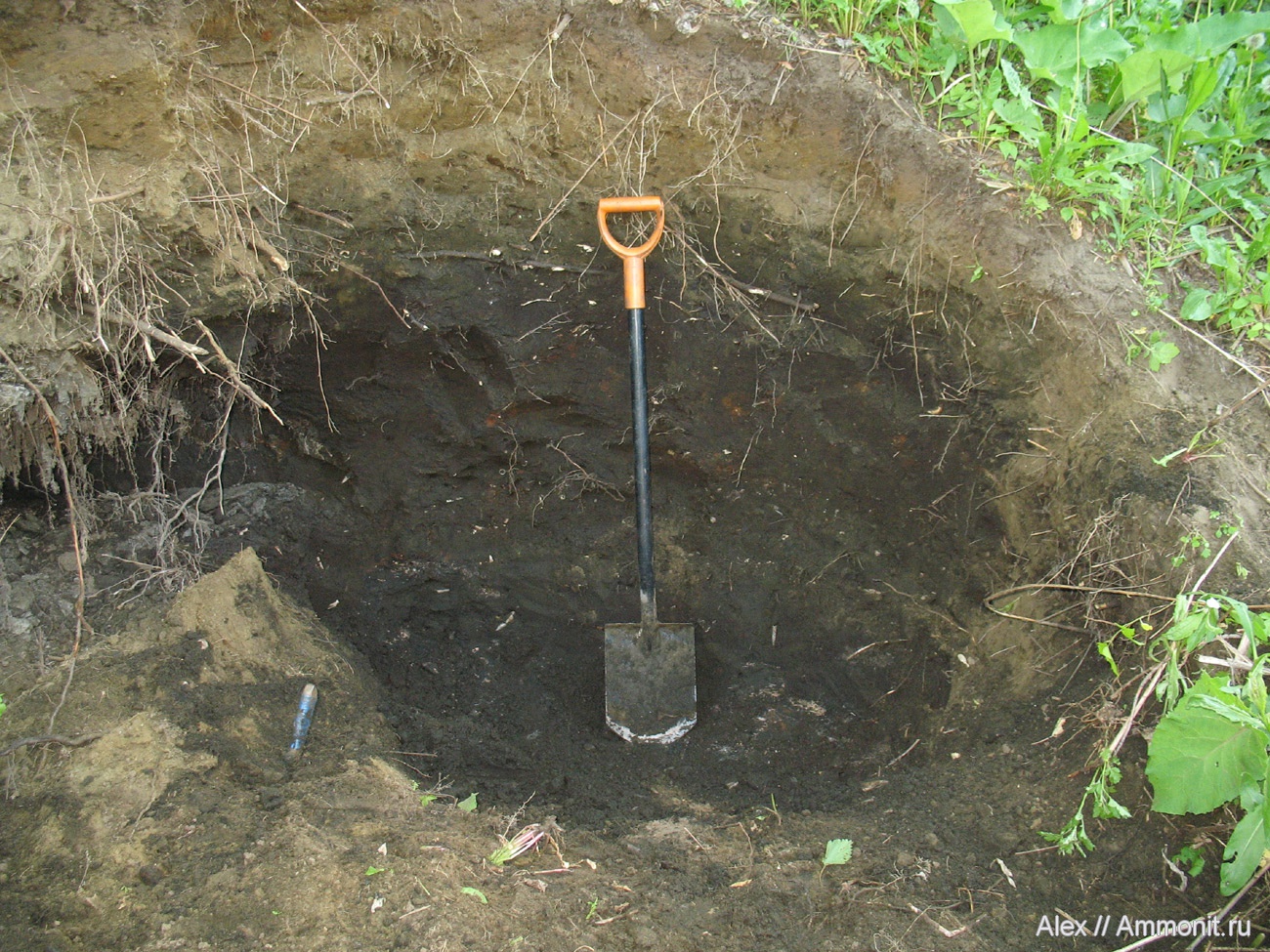 Мощность отложений зоны Kachpurites fulgens в Мневниках. Лопата стоит на присыпанном землей ракушечнике зоны nikitini (ракушечник, видимый внизу, уже фульгенсовый), в песке в верхней части разреза попадаются фрагменты Kachpurites subfulgens. Высота лопаты 120 см.