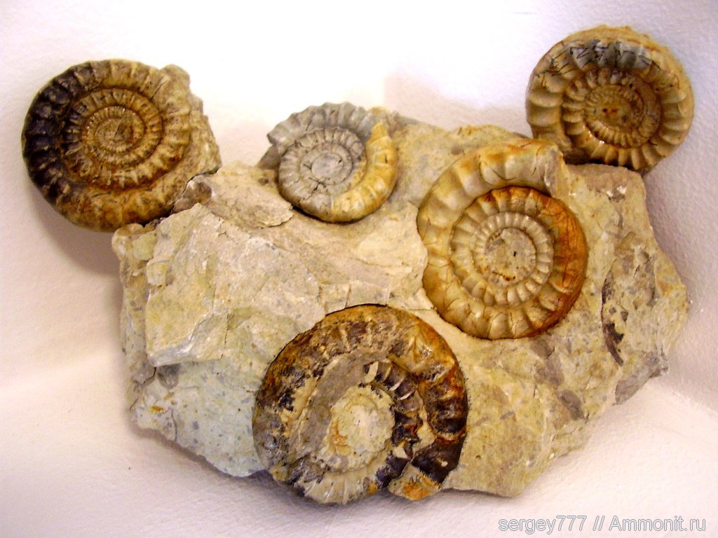 Вот такой подарок мне достался от матушки-природы. Колония аммонитов Arietites (Coroniceras), размеры аммонитов 4-6 см. Трое аммонитов с этой конкрецци, другие два препарированы