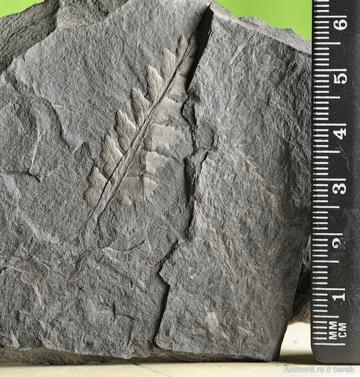Mariopteris и справа проглядывают отпечатки молодых веток лепидодендрона с присоединенными листьями.