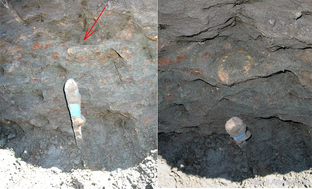 В прошлом году во время раскопок в Еганово разнообразные по форме и ребристости макроконхи попадались мне только у самого основания зоны fulgens и я думал, что период такого разнообразия был коротким. Выше встречались лишь груборебристые довольно тонкие раковины: Макроконх Kachpurites fulgens на месте находки. Однако, в этом году оказалось, что и на высоте 30 см от основания зоны встречаются очень разные по форме и типу ребристости макроконхи Kachpurites. На фото один из таких аммонитов, диаметром около 8 см, длина ножа 25 см.