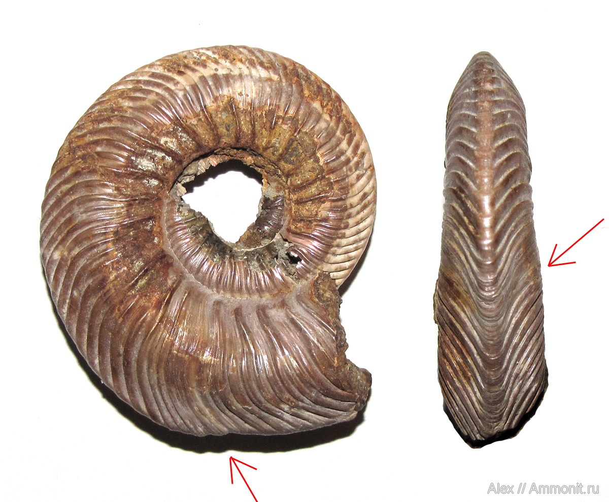 Этот Quenstedtoceras lamberti диаметром 4 см незадолго до строительства итоговой жилой камеры внезапно изменил параметры строительства раковины. Оборот раковины стал шире, но ниже. Этот участок показан стрелочкой. Никаких явных следов на раковине этому изменению не предшествует, значит, либо причиной была не травма, а болезнь, либо, кто-то укусил аммонита не задев его раковину.
