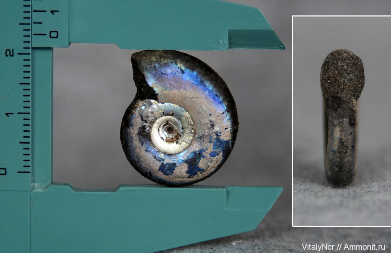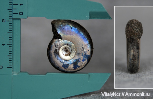 Маленький Kachpurites fulgens с тонким внутренним слоем перламутра синего цвета. В Мневниках они совсем другие, с сохранившимися толстыми средними слоями розового цвета.