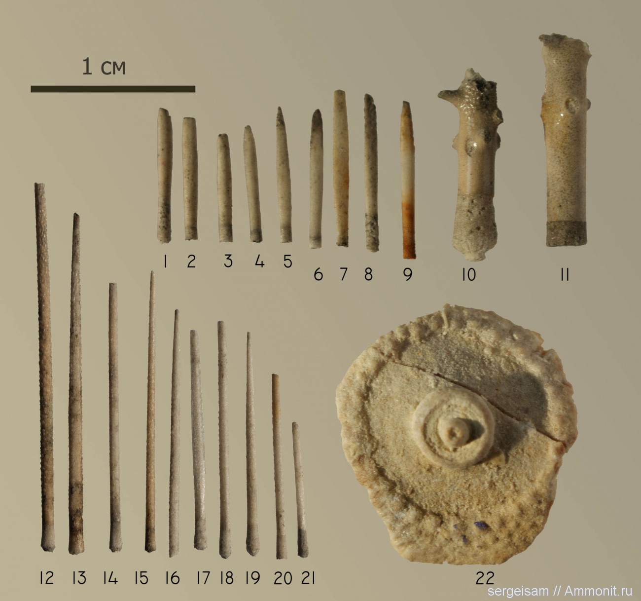 12-21 – Круглые в сечении вторичные иглы. Те что покороче крепились к более удаленным от ареолы бугоркам выполняя защитные функции. Те что подлиннее располагались вокруг ротового отверстия ежа, выполняя функции передвижения и удержания пойманной жертвы.