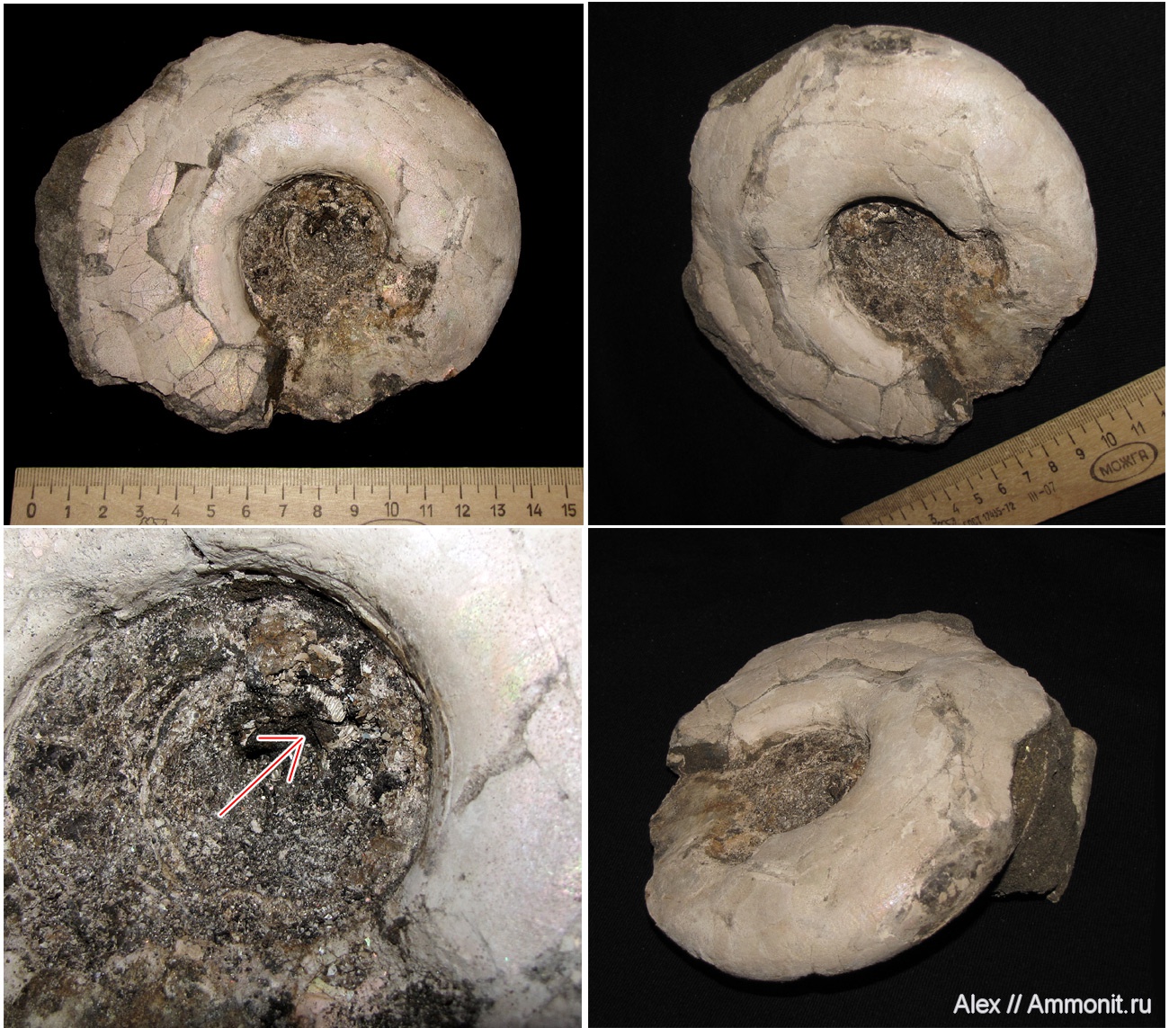 Сейчас заметил, что у этого аммонита заметно типичное для многих макроконхов раскручивание спирали - в районе устья пупок становится значительно шире (фото). | ||||||