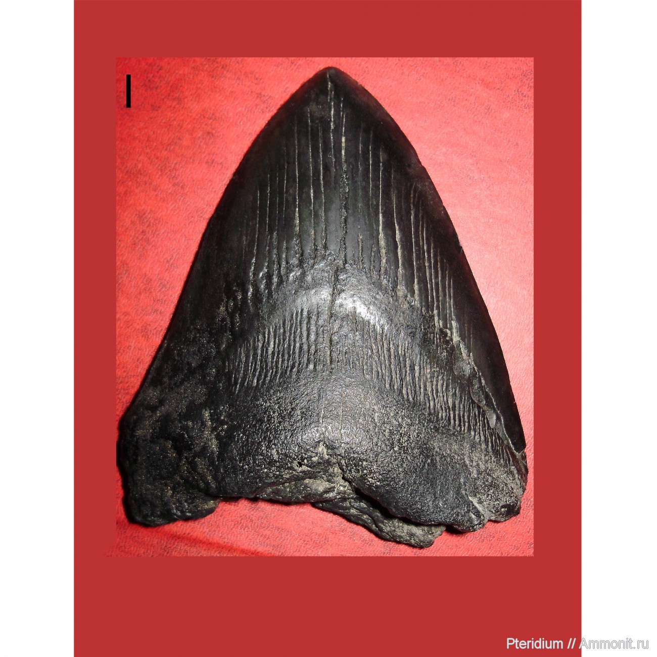 Зуб мегалодона - длина 12,5 см. Неоген США. Длина масштабной линейки на снимке - 1 см.
