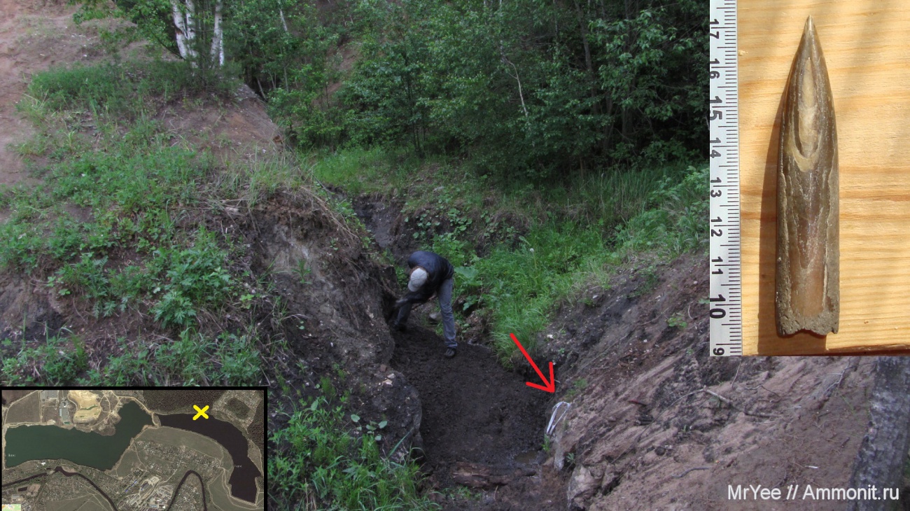 Вот так и выглядит место, где я добываю белемниты. Примерно на уровне моей правой ступни выходит слой оксфордского яруса с белемнитами, и крупными пиритовыми конкрециями c отпечатками перламутра . Стрелочкой указан уровень выхода келловейского слоя с большим количеством ломаных белемнитов и крупными мергелевыми конкрециями. Главной целью своего следующего похода я ставлю исследование именно этого слоя. Слои выше исследованы плохо, могу только сказать, что в них попадаются хиболиты и конкреции с какими-то кардиоцерасами. В одиночку раскопки занимают много времени - глина уж очень тяжело копается.
