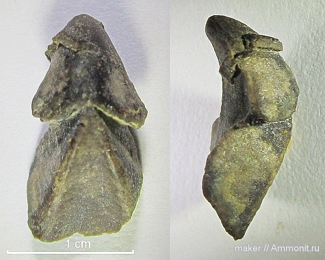 Следы серпулы на капюшоне ринхолита Hadrocheilus (Arcuatobeccus) kuturkajensis Shimansky . Предположительно послежизненное образование. Маловероятно, что бы червь смог без повреждения перебраться через режущий край капюшона ринхолита. Правый снимок показывает предполагаемое положение ринхолита на дне нижнемелового океана в первые годы своего автономного существования.