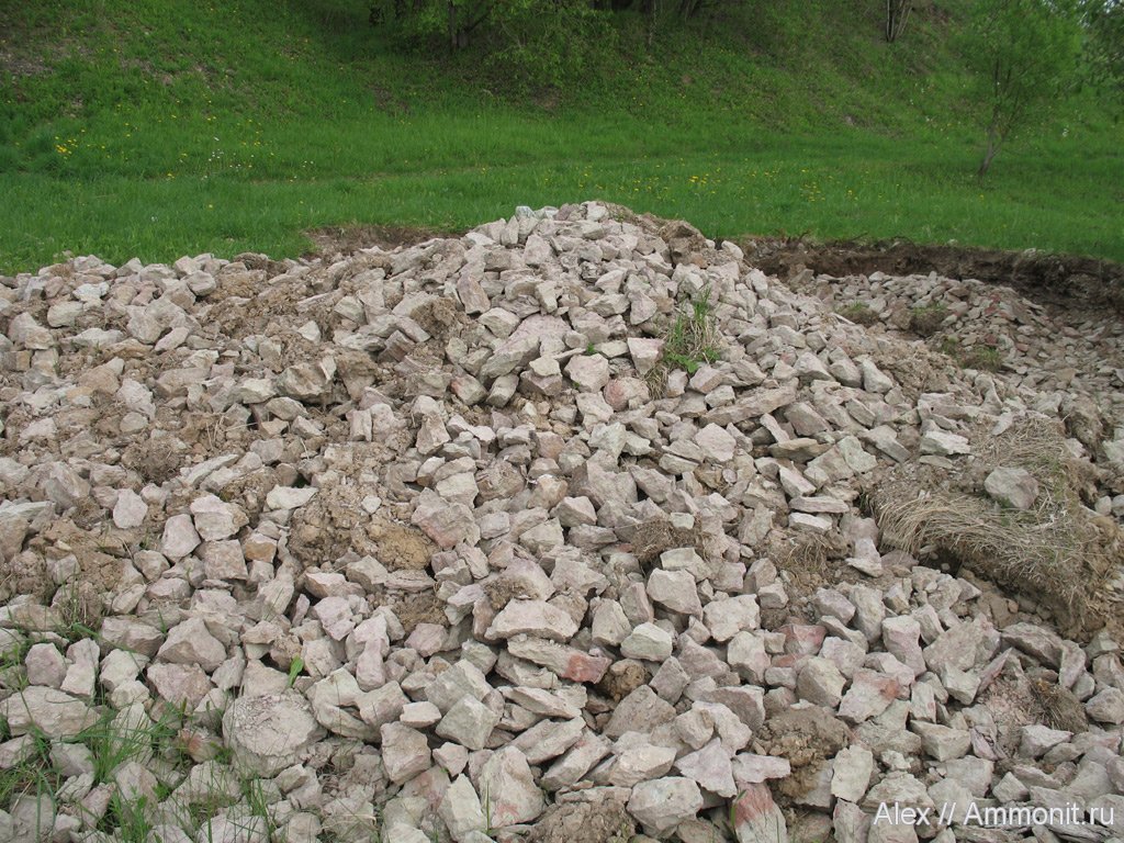 Гора битого ордовикского известняка на правом берегу реки Волхов, чуть ниже по течению от основных известняковых стенок около ГЭС. Судя по всему, здесь трилобитов добывали основательно, с помощью тяжелых инструментов. Лето 2009 года.