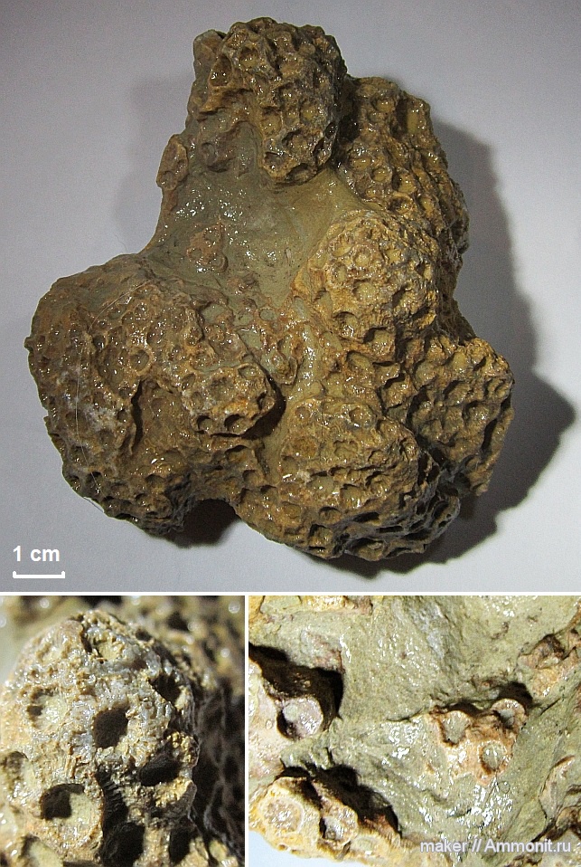 Колония кораллов. Форма естественная. Препарирование природное. Видимо, имело место погребение в морской ил в преддверии смерти кораллового рифа Ай-Петри. Часть окаменелого ила можно наблюдать на образце. Поначалу, я его даже трогал руками, ожидая что он мягкий. Настолько он естественно выглядел.