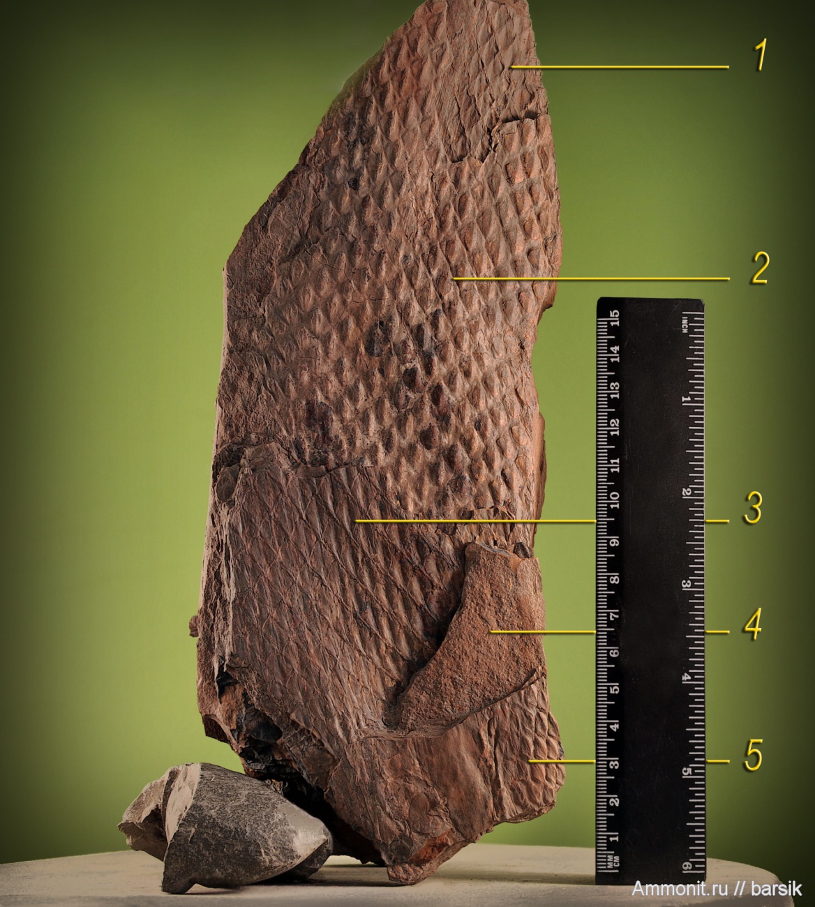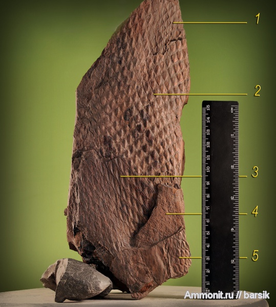 На снимке хорошо видна слоистость коры ветви лепидодендрона. Уже на глубине, примерно 1 см, прослеживается явное изменение очертаний листовых подушек. Слой 5 имеет более выраженный рельеф, чем слой 2, ну и слой 4, к сожалению, не выдержал транспортировки и осыпался.