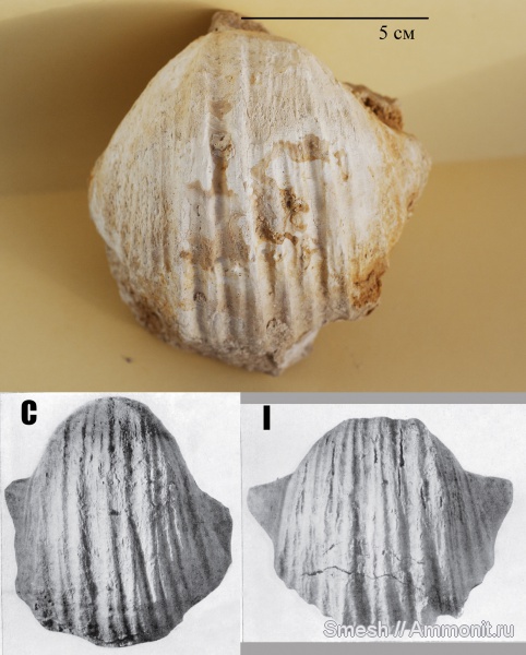 22 июля 2012 года небольшая группа энтузиастов во главе с уважаемым Kach посетила карьер близ деревни Хомяково Тульской области (Посещение Хомяковского карьера). Первое, что бросалось в глаза ещё до входа в карьер, это лежащие по обочине дороги глыбы известняка с гигантопродуктусами. Наличие этих продуктид однозначно указывало на нижнекарбоновый возраст разрабатываемых в карьере известняков. Попробуем уточнить датировку пород карьера. Решим своего рода обратную задачу, то есть определим возраст пород по найденным в них окаменелостям. В [1] всего два вида похожи на образец, представленный здесь на фото: Gigantoproductus crassus (Martin) и Gigantoproductus inflatus (Sarytcheva). У них характерная очень грубая ребристость и они относительно «компактны», т.е. ширина ненамного превышает длину или примерно равна ей. Репродукции их из [1] помещены на фото снизу и обозначены буквами «С» и «I» соответственно. Суженная макушка и торчащий посередине одинокий обломок иглы позволяют склониться к соответствию нашего образца Gigantoproductus crassus (Martin). Но не исключено, что это всё-таки вариация G. inflatus. Гораздо более похожа на него раковина Gigantoproductus inflatus из хомяковского карьера