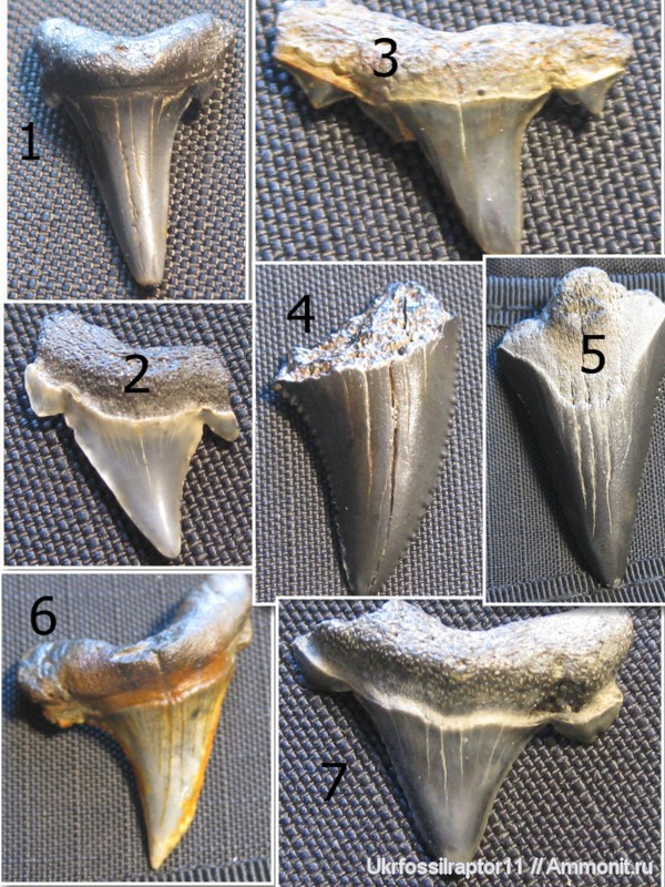 7 - верхний задний Carcharocles(Otodus) sokolowi 1,5 см