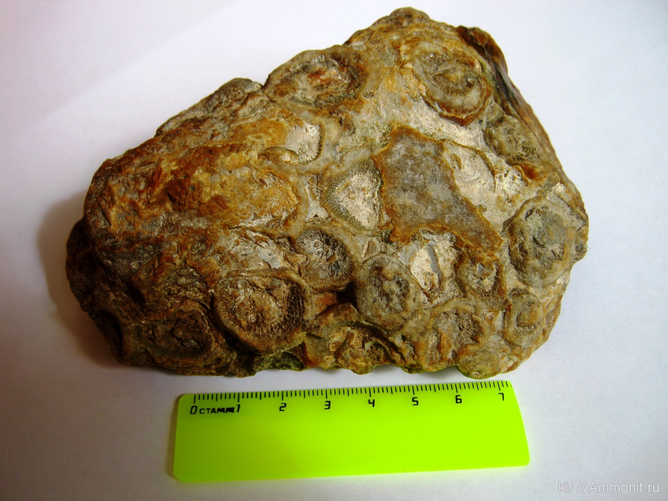Обнажения-то есть, но эта окаменелость найдена в щебенке какого-то из близлежащих карьеров, возможно из Слизневского или Каменского. Дно реки Нары возле участка каменистое, сложенное известняком.И в окрестностях раньше добывали известняковый туф для известкования полей. Литературу смотрел, никаких подробностей по геологии реки Нара не нашел. | ||||||