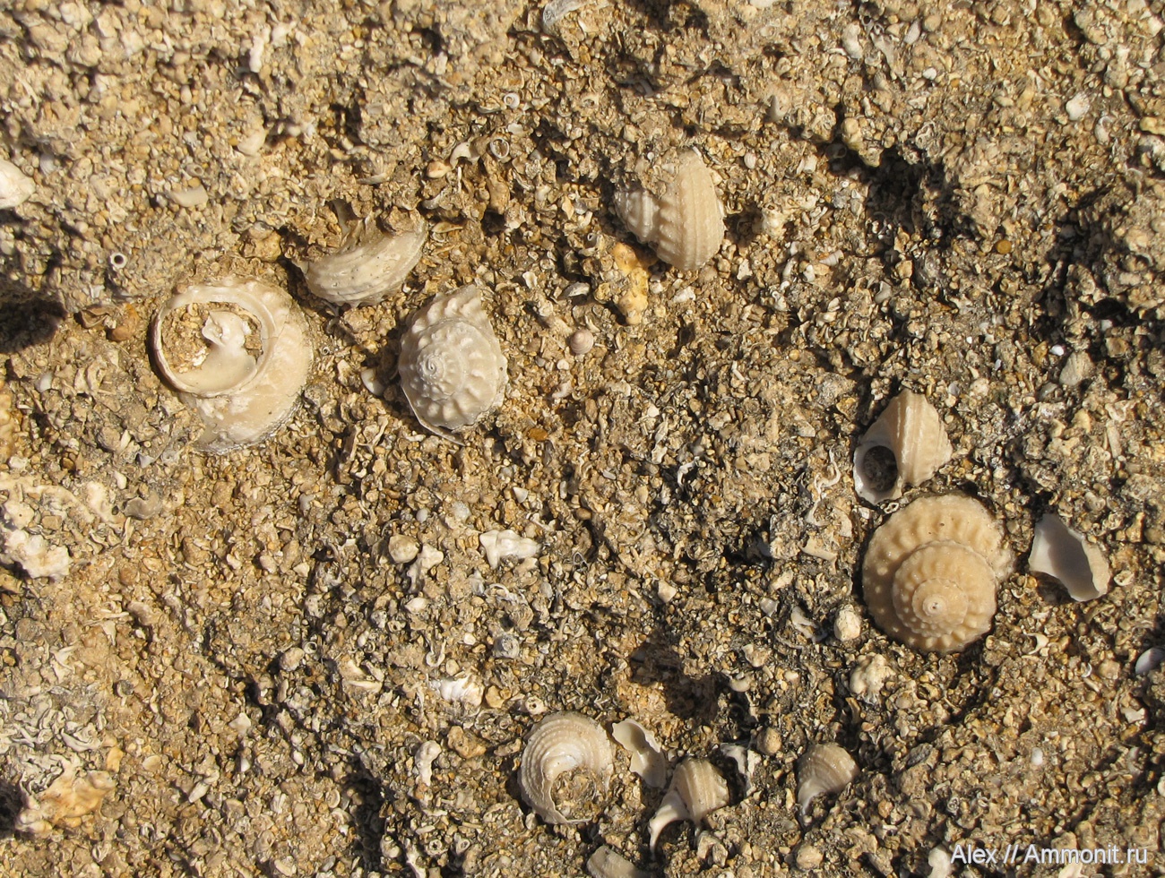 На этом фото - типичнейшие представители палеофауны из окрестностей города Пафос - гастроподы рода Turbo. В прибрежных скалах их тысячи, если не десятки тысяч. Средний размер раковин - 3см, однако есть и пятисантиметровые и относительно мелкие. Органогенно-обломочный известняк, вмещающий эти раковины, очень прочный. Иногда кажется, что раковина лежит на поверхности, но на самом деле нижняя часть ее находится в породе и отломать или отбить такой образец очень сложно. К счастью, есть места, где море размывает эти слои и там раковины легко вынимаются из размокшей породы.