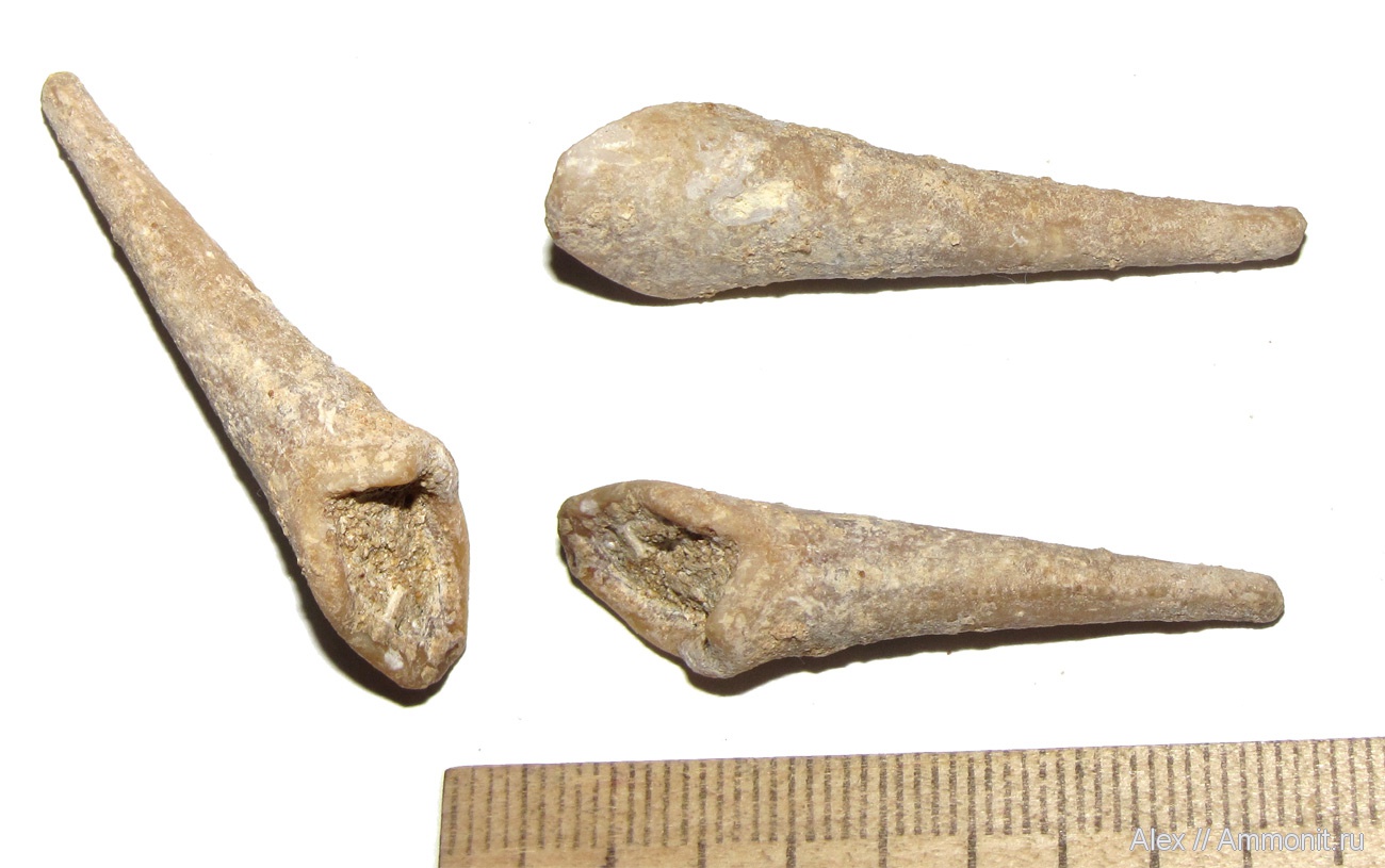 Нет, это не лопатоногий. Лопатоногие там тоже попадались (Неогеновые скафоподы), да и в нашей юре это не редкость, но у них оба конца раковины открыты (тут на узком конце отверстия нет), у них несколько иные пропорции и нет гребня на боку. | ||||||