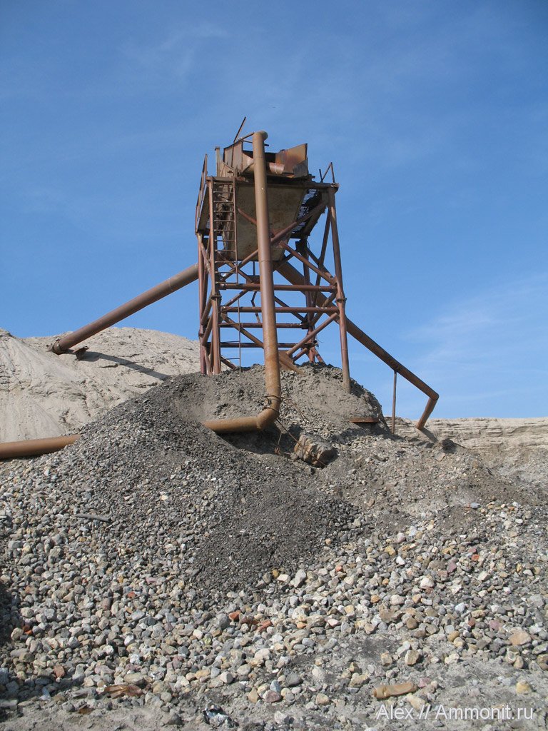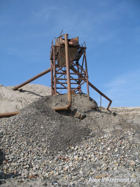 Вышка и куча в Электростальском карьере. Видно, что куча состоит в основном не из фосфорита, а из ледниковых окатанных булыжников. Судя по всему, раньше куча была значительно больше, за зиму большую часть увезли.