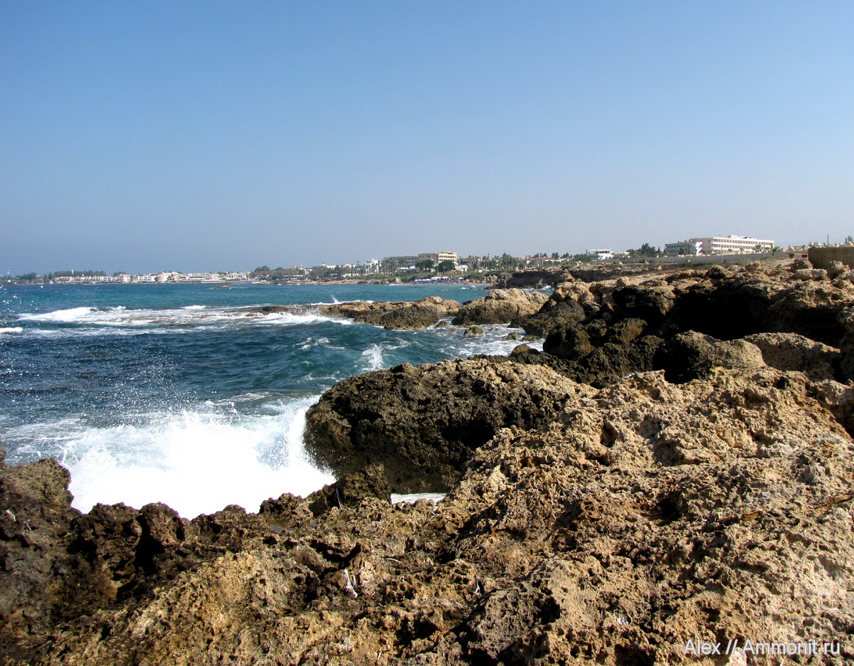 Неогеновые скалы на юго-западном побережье Кипра вблизи города Пафос. Отсюда добыта большая часть окаменелостей, представленных в этой галерее. Из размывающегося водой известняка древние раковины падают в море, где смешиваются с раковинами современных гастропод.