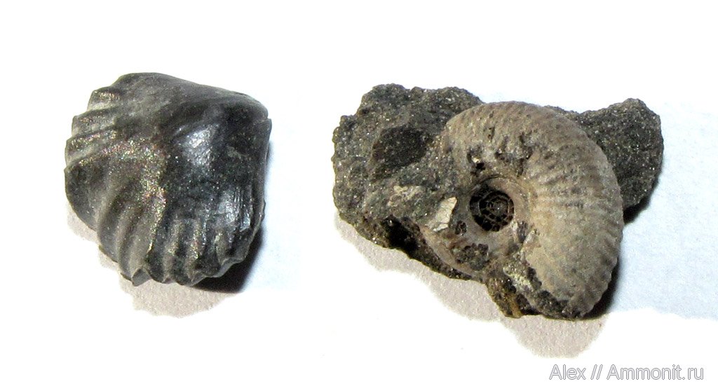Брахиопода Rhynchonella (?) vorobievensis и маленький аммонит (Dorsoplanites sp.?), найденные в одной конкреции на Электростальском карьере. Брахиопода имеет ширину в 1 см в самой широкой части, аммонит - максимальный диаметр 8 мм.