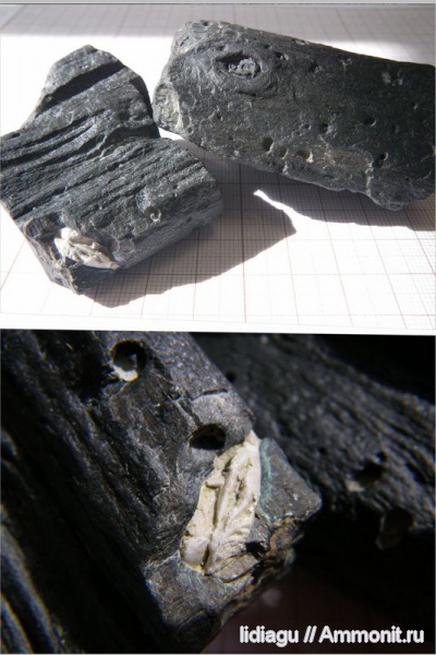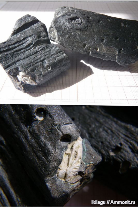 Фосфоритизированная древесина со следами двустворок-камнеточцев с берега Волги. На нижнем фото и сама двустворка.