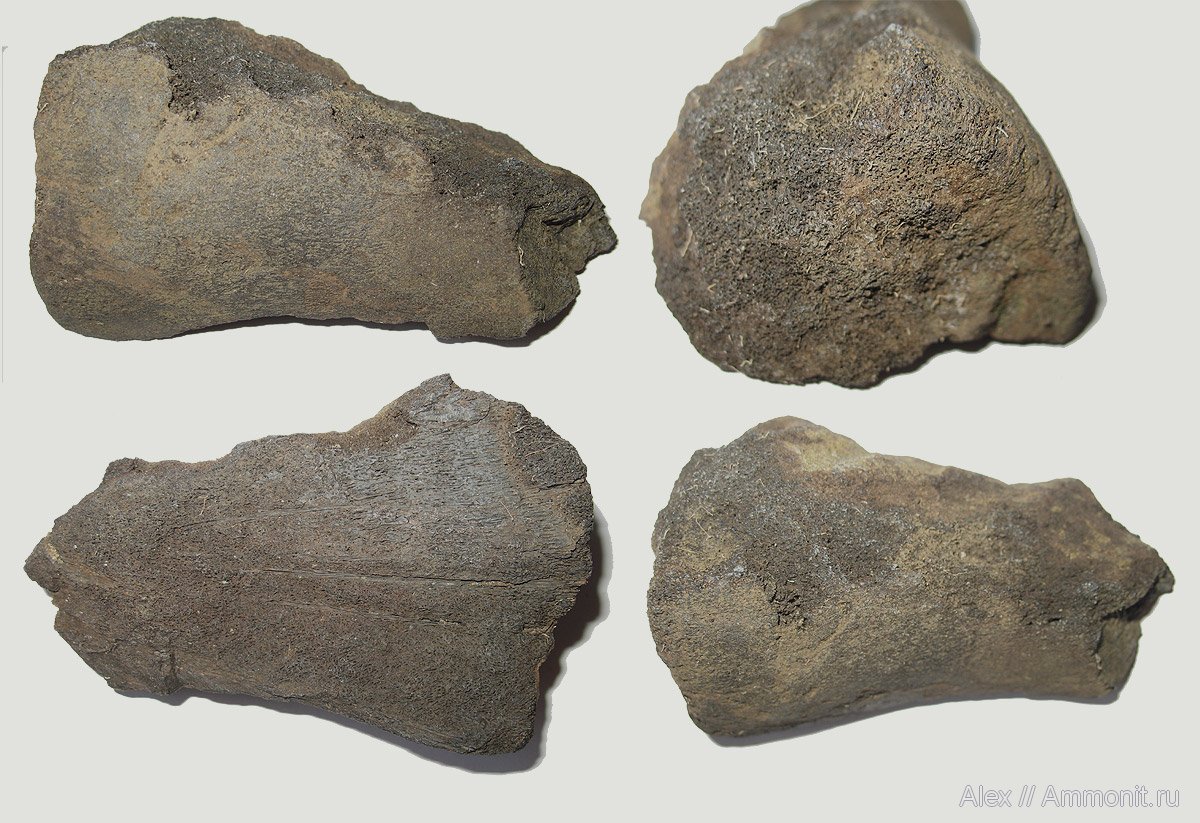 Фрагмент кости морской рептилии. Длина фрагмент 10 см, максимальная ширина - 6 см. Образец был найден в нескольких сантиметрах под поверхностью отвала и внутри кости видны корешки растений, которые проросли с поверхности.