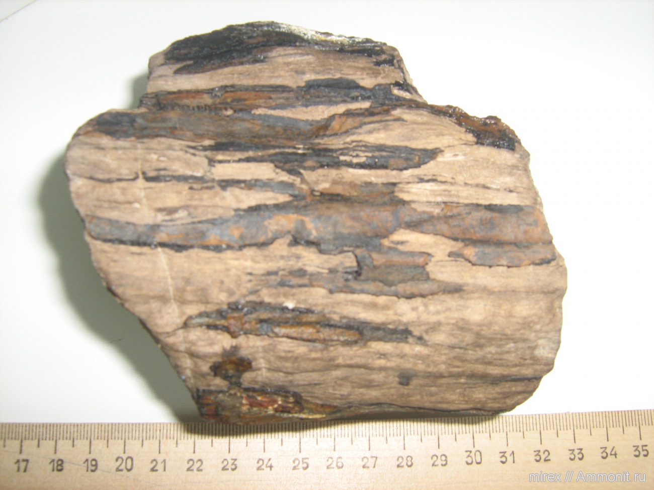 Предположительно сохранились остатки коры. На торце образца есть следы годовых колец. Найден в ручье без названия в пос. Кривенковское, Туапсинского района.