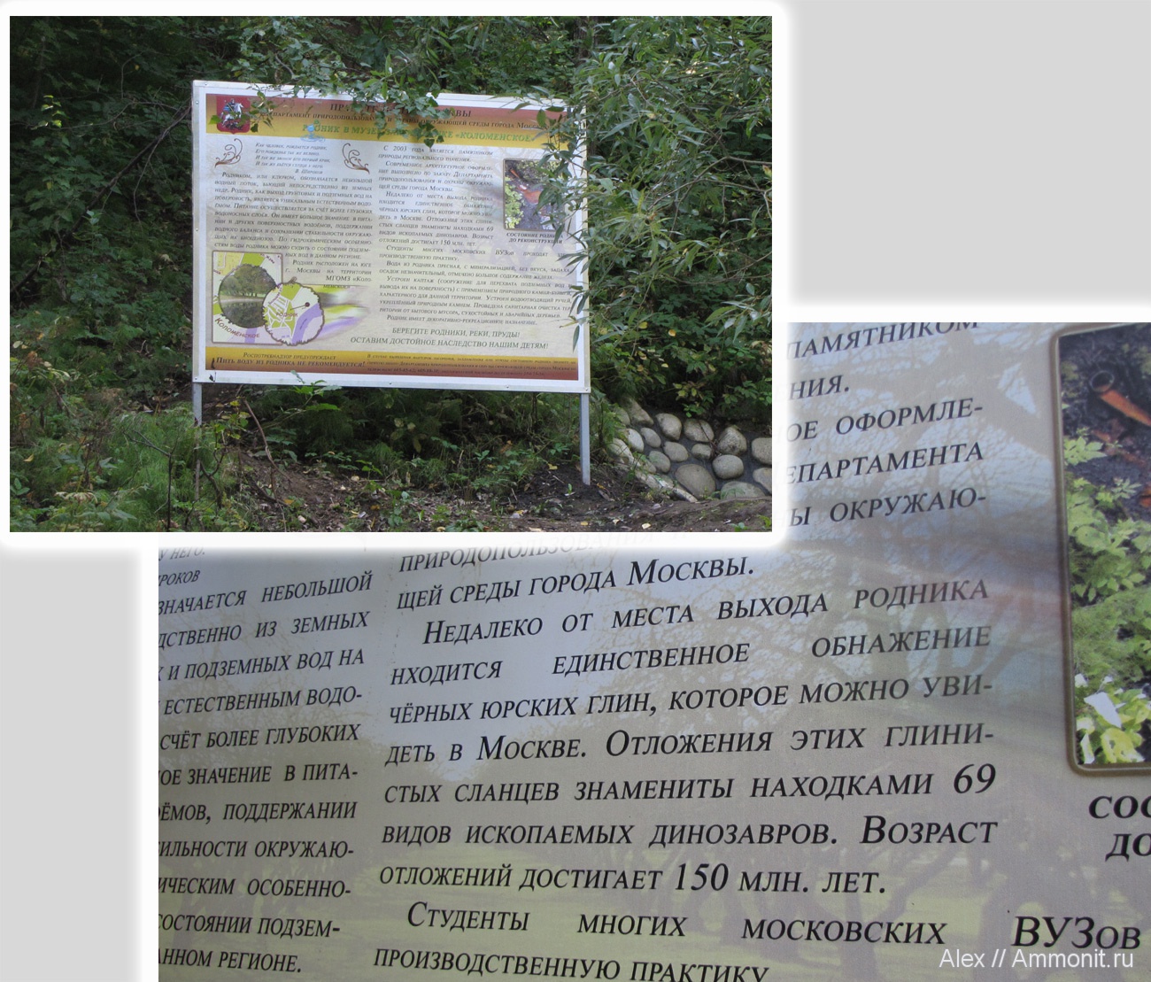 На фото плакат, который появился в 2009 году в овраге с юрскими глинами в Коломенском. Этот стенд посвящен находящемуся там роднику, но юрские глины на нем упомянуты. Упомянуты, правда, в типичном официально-безграмотном стиле - там сказано, что это единственное обнажение юрских глин в Москве и что в этих глинах найдено 69 видов ископаемых динозавров :)) Динозавров как таковых, ископаемых и не очень, из всего Московского региона известен всего 1 вид (из Песков), и даже если обозвать динозаврами морских рептилий (ихтиозавров, плезиозавров, плиозавров), то получится от силы видов 10, но никак не 69. Откуда взялось это число и чем уж оно так приглянулось безымянному автору стенда, остается только гадать. Зато обнажений юрских глин в Москве не так уж и мало.
