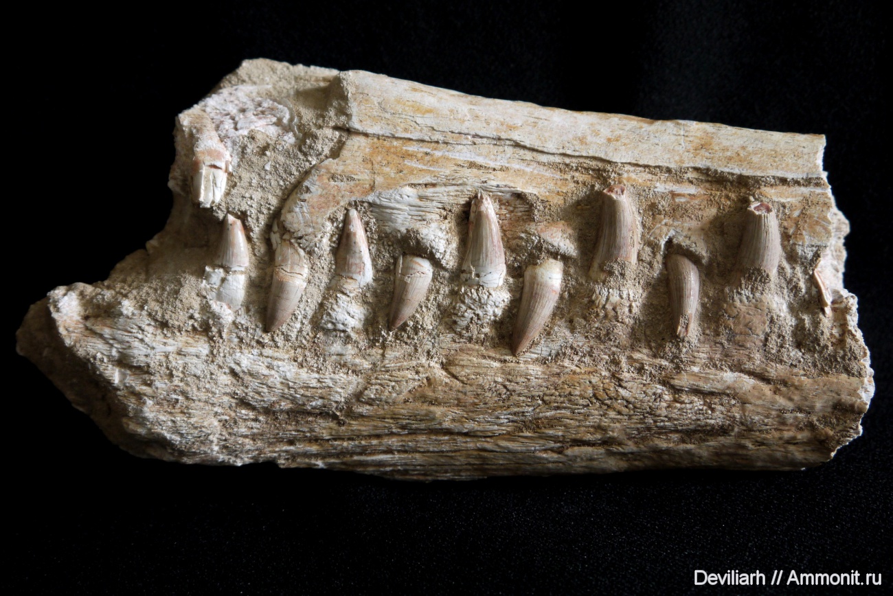 Часть верхней и нижней челюсти древнего крокодила Dyrosaurus phosphaticus. Другая сторона сохранилась очень плохо, но в парочке мест где породы нету видны остатки нескольких зубов Также есть ещё несколько частей от этой челюсти, где отлично видна структура кости и ещё парочки зубов внутри породы.