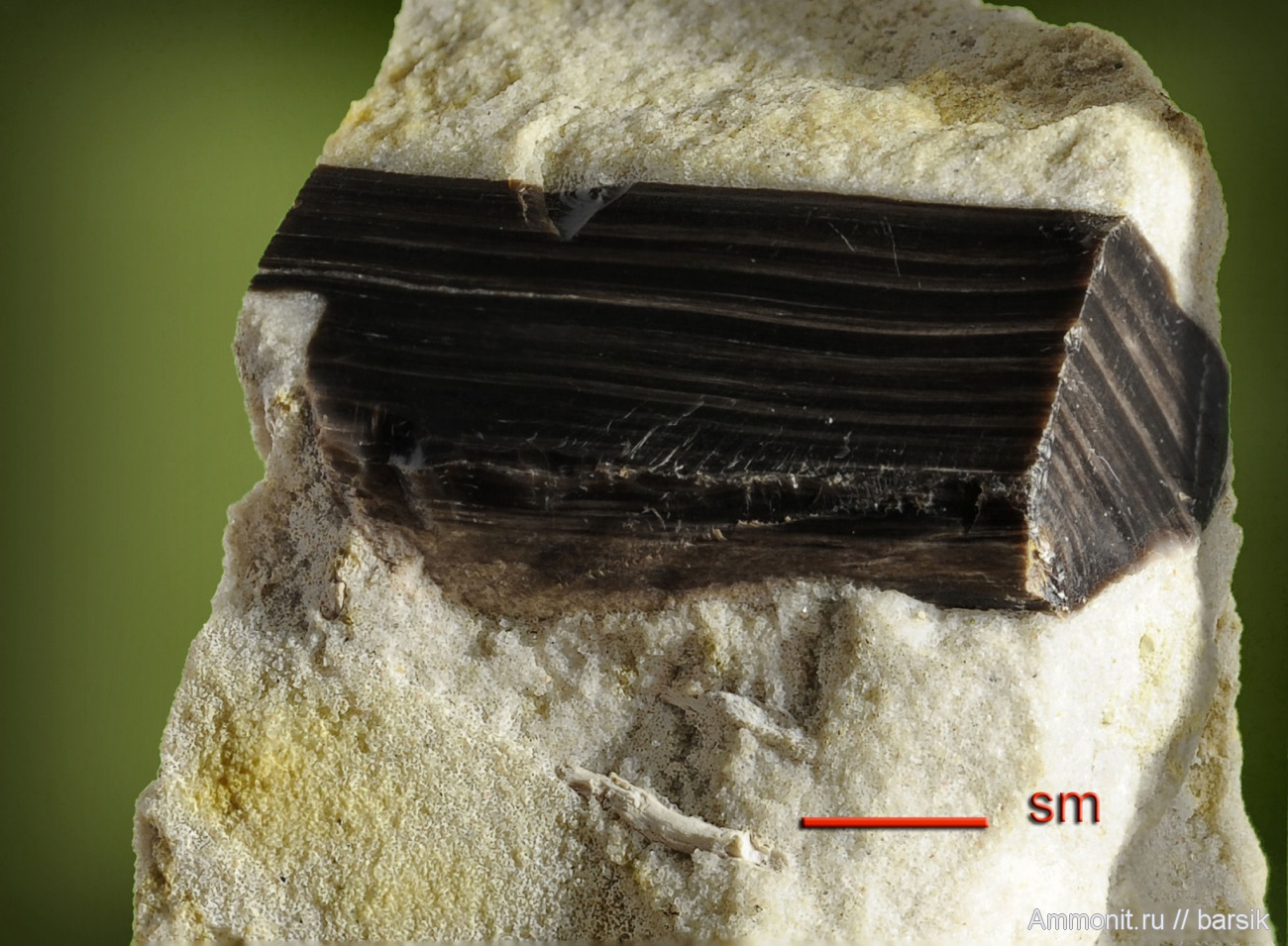 Превосходный образец! А внизу, слева от масштаба, что за окаменелость? | ||||||