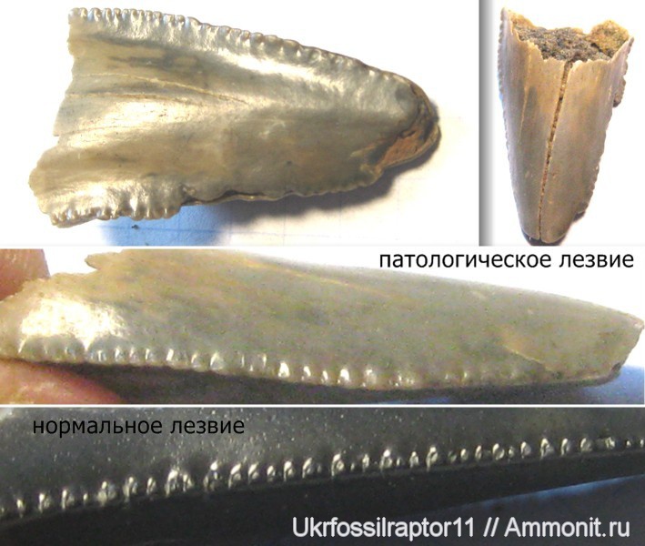 Этот зуб интересен своим искривленным лезвием, это неплохо видно на фото "патологическое лезвие". На дистальной стороне кромка сохранилась хуже, поэтому она и не показана. Внизу для сравнения зуб этого же вида с нормальным лезвием.
