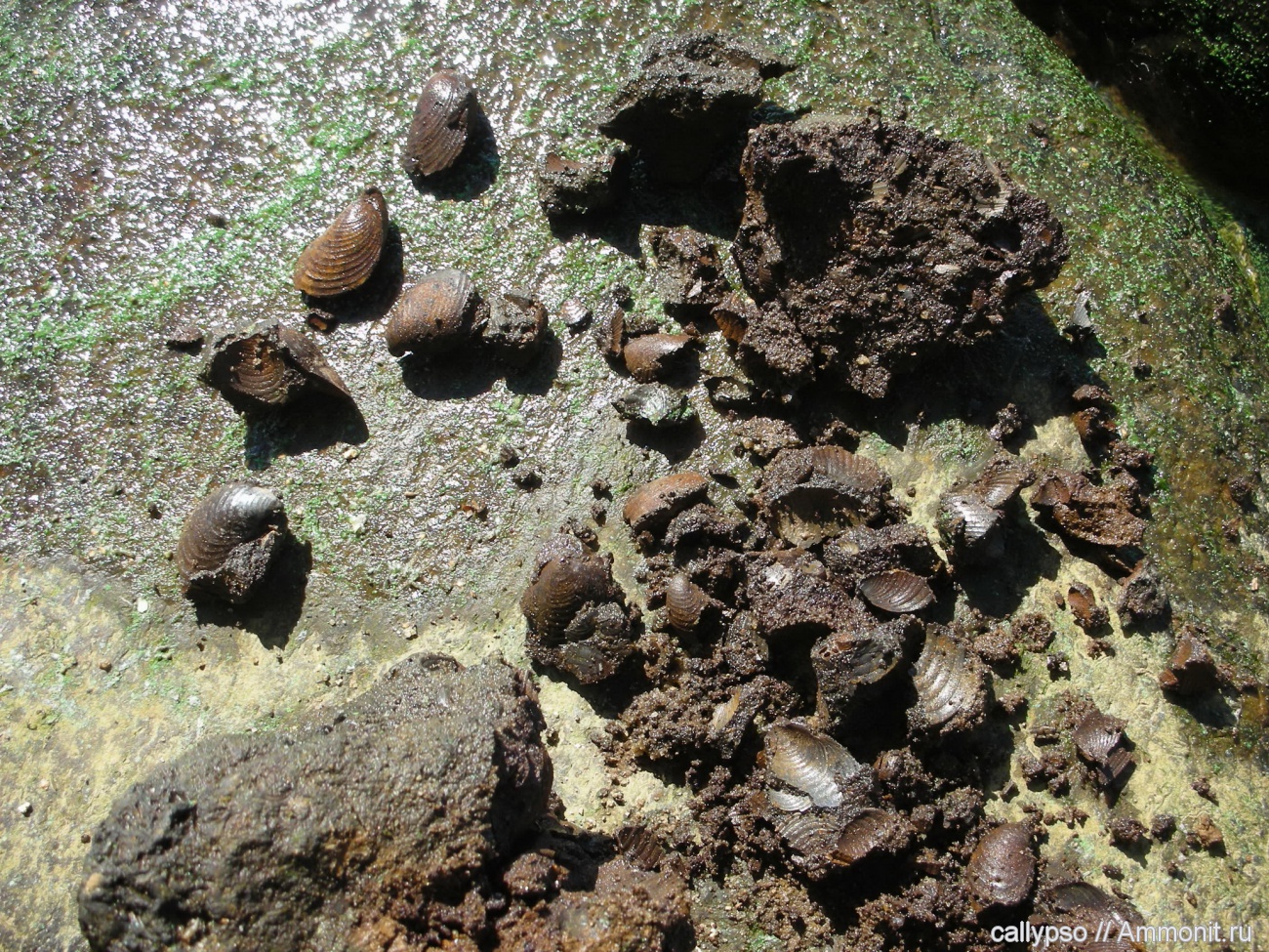 Только-что разбитая конкреция железистого песчаника и извлечённые из неё бУхии, проходящие просушку на солнышке.